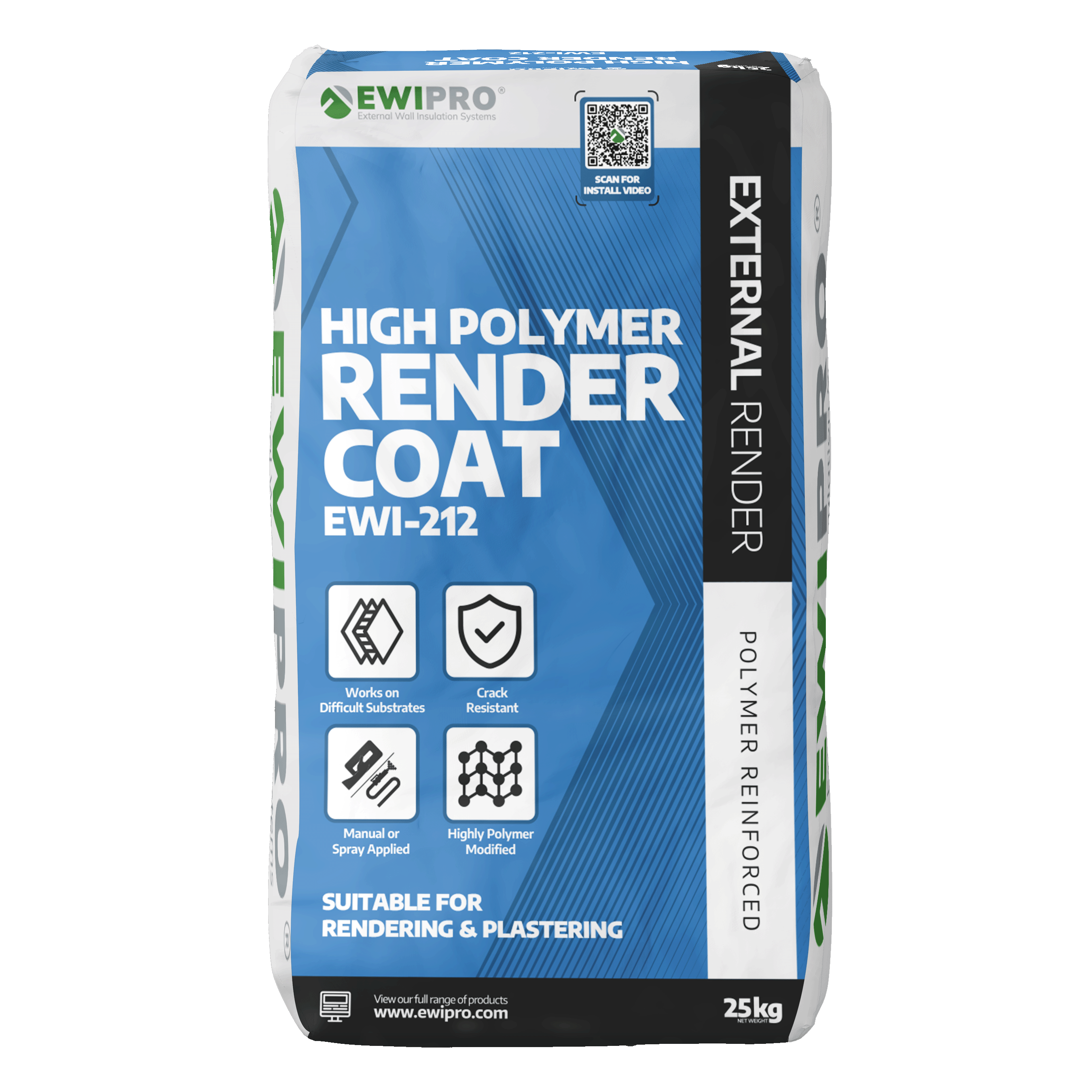 EWI-212 High Polymer Render Coat is a high-performance, polymer-modified, cement-based render coat developed to deliver excellent adhesion, flexibility and durability on a wide range of backgrounds. It is designed to level and stabilise surfaces before the application of subsequent render layers or thin-coat finishes.