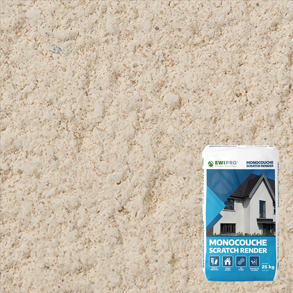 The EWI-090 Monocouche Render is a high-performance cement-based, through-coloured scratch render. This decorative render has been designed with water-repellence, breathability, and durability in mind. The EWI-090 is used on both larger commercial or residential projects, and suitable for concrete, clay, block, and brick substrates. Monocouche Scratch Render is a thick coat render that is applied in two passes. The material base is comprised of premium quality Portland cement, hydrated lime, polymers and modifying admixtures. This delivers enhanced adhesive properties, ensuring a flexible and crack-resistant finish is achieved. The EWI-090 is a low maintenance product that achieves a natural stone-like appearance for a long-lasting decorative finish.