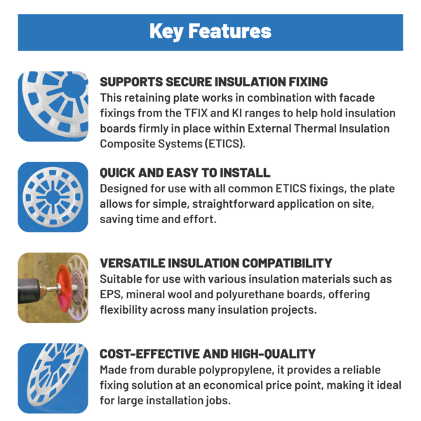 RAWLPLUG KWL – 090PP Fixing Spreader Washer (90mm) is an insulation retaining plate that can support the insulation system installation process. This fixing spreader washer is ideal for use alongside façade fixings to improve the structural integrity and hold of the system.