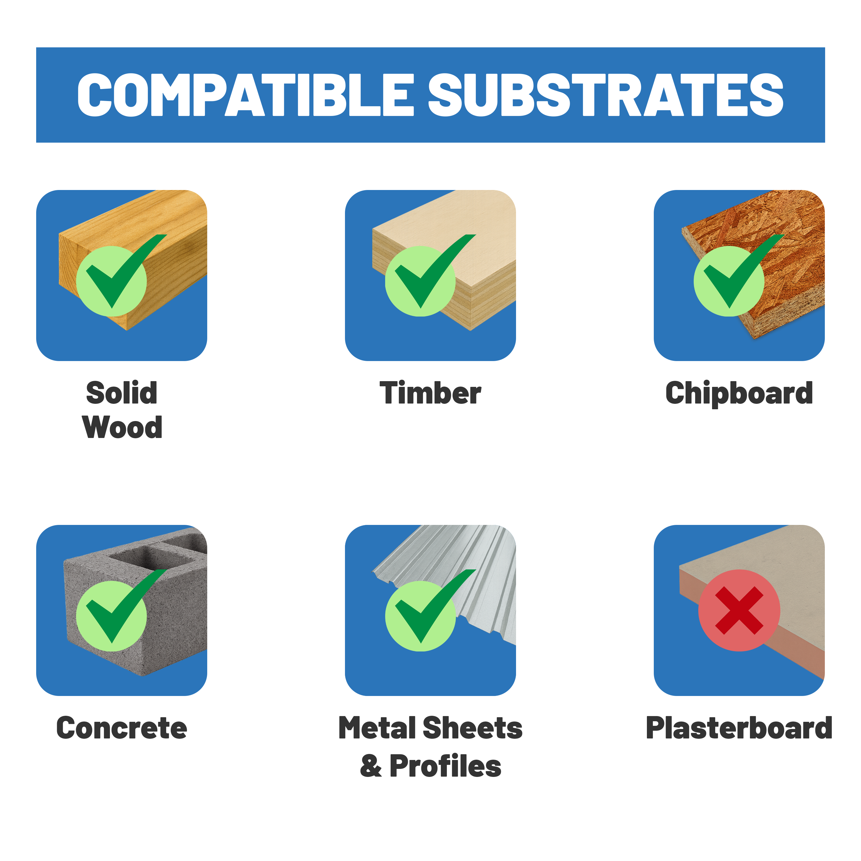- Metal substrates (with either WB or WX screws).