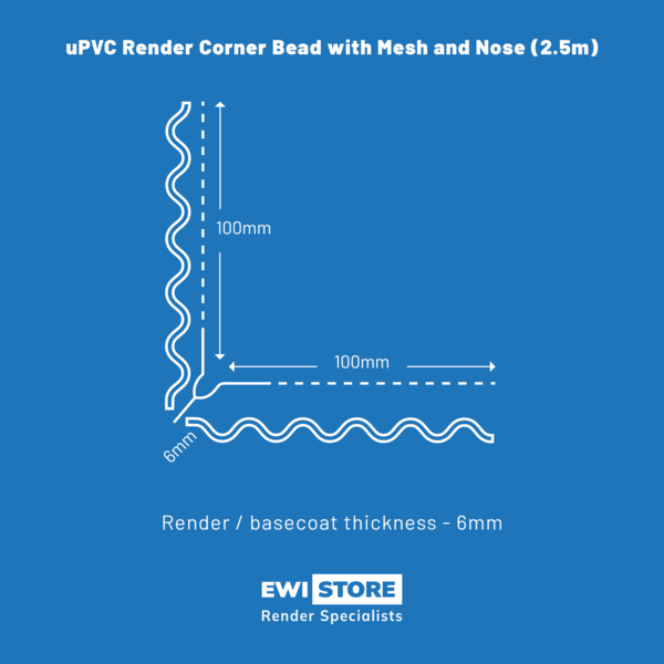 This Render Corner Bead with Mesh and Nose is designed for thin coat render systems, specifically for 90° external corners. Made of rigid PVC, it features a 90-degree angle and two fibreglass mesh 'wings' that integrate the bead into the render system. While a nose is not typically necessary, as the bead is usually fully embedded in the basecoat layer, some installers prefer it for depth guidance. The bead not only ensures precise 90-degree corners but also offers impact protection. This corner bead is 2.5m long and has a 3 or 6mm nose.Frequently Asked Questions